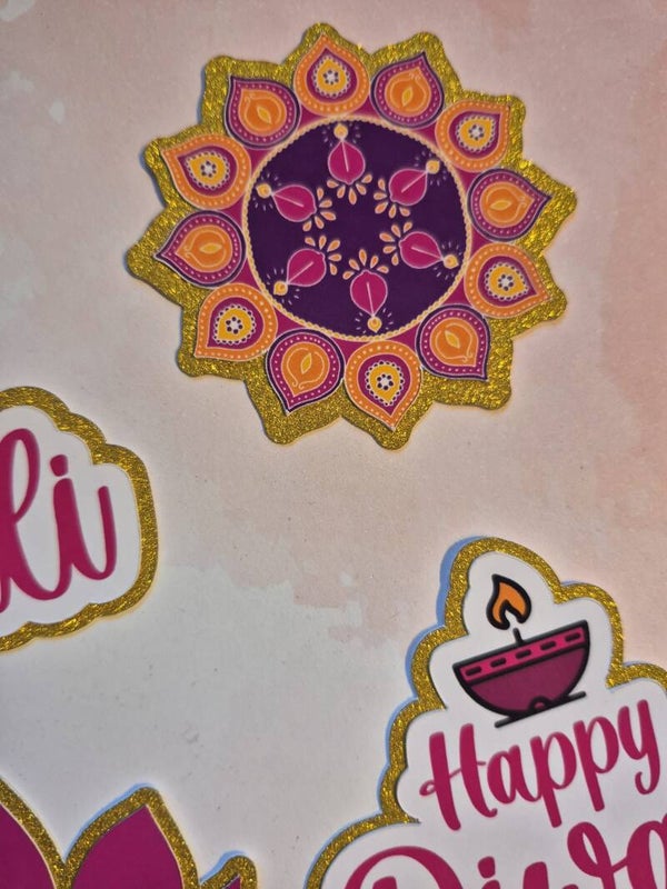 🎇 Breng de magie van Diwali tot leven met deze prachtige mini toppers! Elk setje bevat 6 unieke, dubbelgelaagde ontwerpen met een onderlaag van glitter goud die schittert in het licht – ideaal voor taarten, cupcakes, traktaties of decoratie.